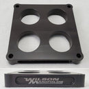We offer the most complete line of 4-Hole Tapered spacers in 390, 4150, 4500, Q-Jet & 2bbl adapters to provide the high performance consumer with the ability to tune their engine for the maximum performance for any application. Wilson Manifolds is the only manufacturer to offer a choice of tapered spacer heights and produces the only fully CNC machined billet tapered spacer on the market. Wilson Manifolds Tapered spacers will benefit any vehicle that operates under both part and full throttle conditions such as bracket racing using a throttle stop, drag racing, circle track, road racing, off shore power boats, street/strip engines and towing vehicles.ÿ