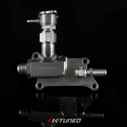 K-Tuned has updated the design of their popular Swivel Neck Thermostat Housing to use an OEM style thermostat which will maintain the factory cooling recirculation port. The OEM styles T-Stat will close off the recirculation port when the thermostat opens. We also have included two rad fittings, the standard 1.25" hose outlet and an optional 16AN hose outlet. Swapping out to different temp thermostats would use a 2002 RSX Type S Thermostat.
